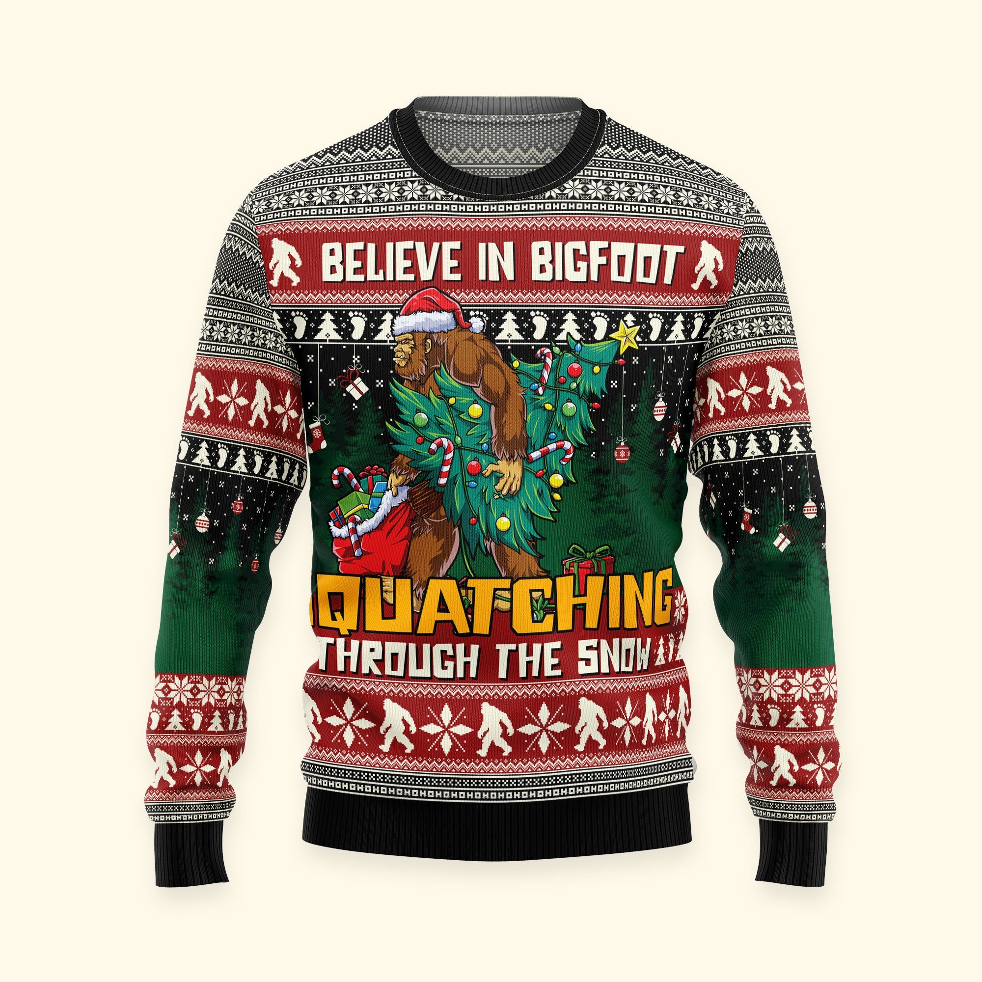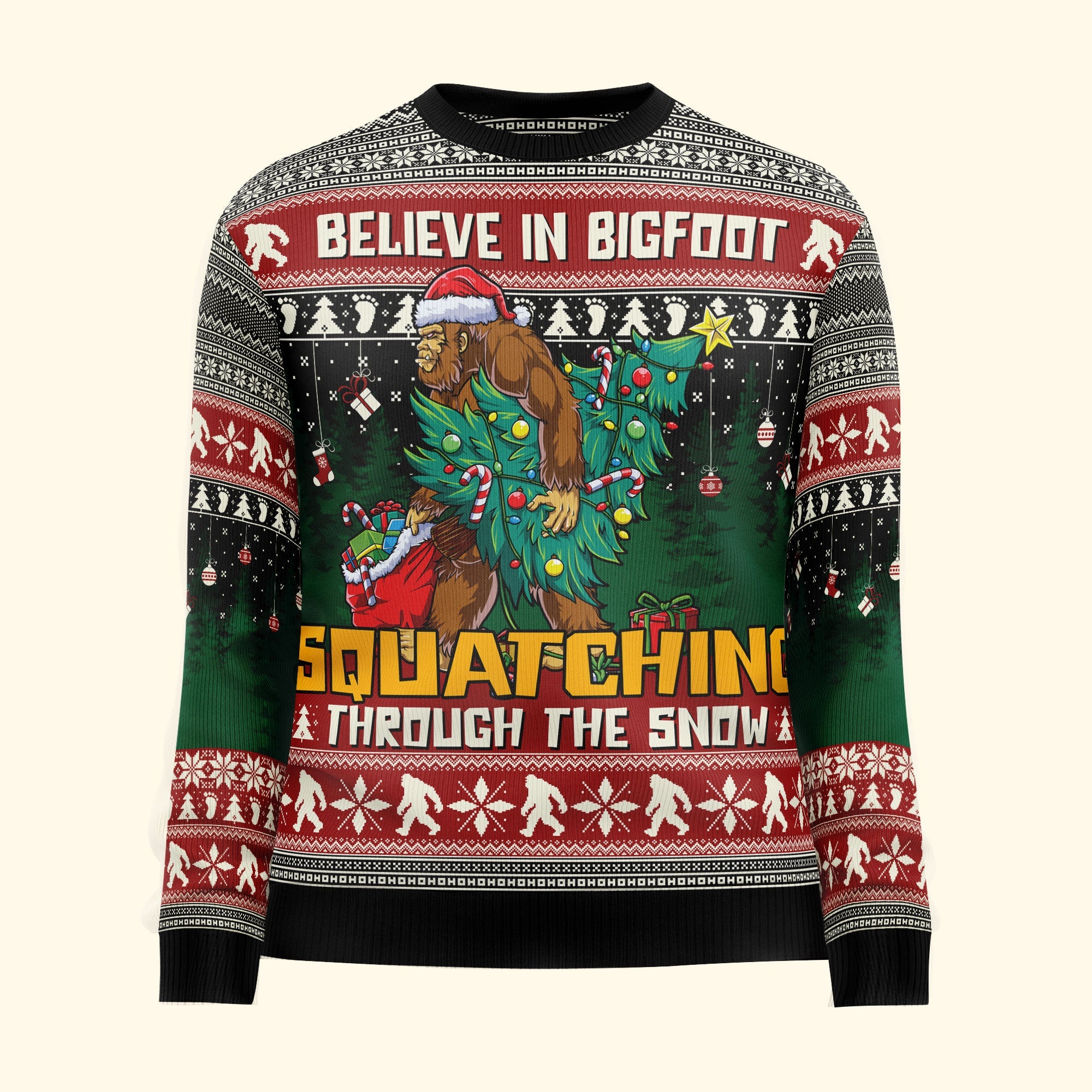 Embrace the whimsy of the season with the “Believe In Bigfoot Squatching Through The Snow” ugly sweater. This unique sweater captures the charm of the holidays with a playful twist on the legendary Sasquatch. An ideal gift for men, including husbands, sons, friends, and anyone who loves a good laugh. This sweater adds a touch of humor and mystery to your festive celebrations. Whether you’re heading to an ugly sweater party or just spreading holiday joy, this sweater is sure to be a hit. Show your belief in the holiday spirit and the legendary Bigfoot with this fun and personalized sweater!